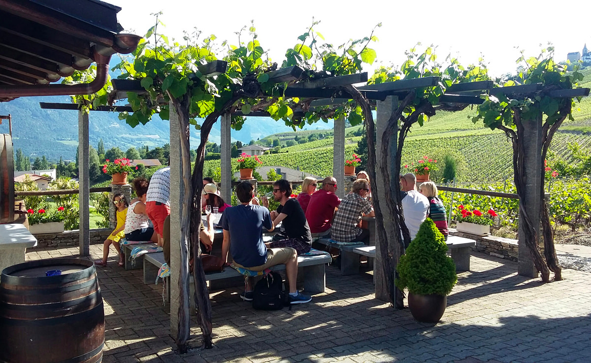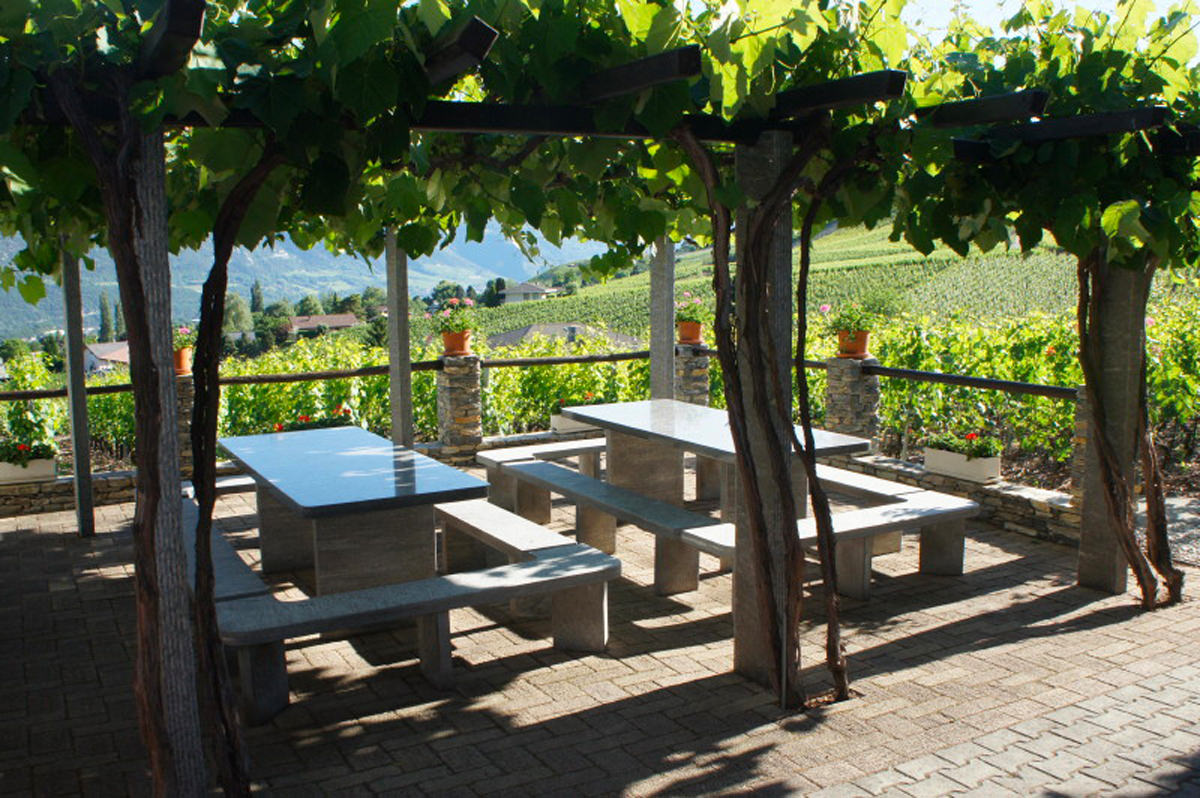 Wir empfangen unsere Kunden in der Pergola in der Nähe der Kellerei und der Rebberge oder im gemütlichen Carnotzet.