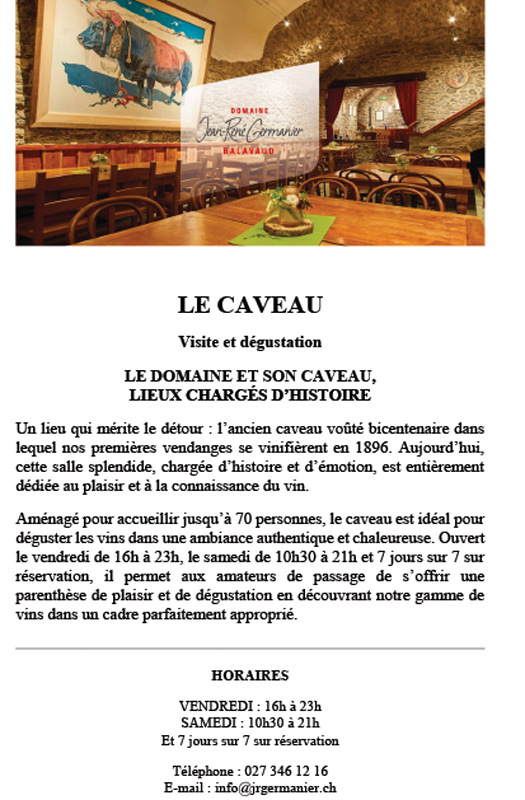 Dès 1896, lorsqu’Urbain Germanier récolte sa première vendange à Balavaud, il se consacre avec passion à son vignoble. Plus tard, ses trois fils, Francis, Paul et Charles reprennent le flambeau et classent leurs vins parmi les premiers crus du Valais. Vers 1940, Francis Germanier décide de planter dans la plaine du Rhône une variété de poire destinée à la table et appelée William, du nom de son sélectionneur: «Bon Chrétien William». En 1945, un violent orage met toute la récolte à terre. Face à ce désastre, Francis décide de distiller les fruits. L’eau-de-vie produite se révèle d’une saveur et d’une harmonie extraordinaires. Le Bon Père William, incarné par l’image mythique de la poire dans la bouteille, était né! Il va rapidement s’imposer comme l’une des spécialités les plus typiques du canton. La production de spiritueux a longtemps représenté une part importante de l’activité de la maison, avant que l’activité viticole reprenne une place prépondérante au courant des années 80. Aujourd’hui, les troisième et quatrième générations – Jean-René Germanier et son neveu Gilles Besse, tous deux oenologues – poursuivent la tradition familiale du vin et des spiritueux, avec une passion, une curiosité et une préoccupation de la qualité intactes. Ils produisent des vins qui les classent parmi les meilleurs producteurs suisses, en portant une attention toute particulière aux cépages locaux et aux spécialités de ce terroir unique qu’est le Valais.